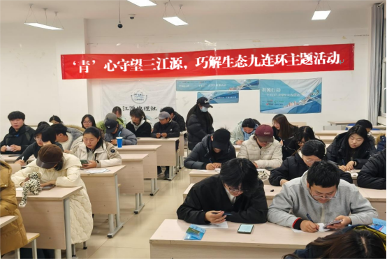 活动以参与者在校园派发生态知识宣传卡片及折页开始。然后,主持人围绕三江源面临的问题、动物保护等方面进行了系统讲解。随后,同学们通过“青海省地势拼图”“生态谜语竞猜”“生态主题剧本杀”与“环保视角狼人杀”等环节,亲手感知了三江源地区的宏观地貌,将专业知识与趣味谜题巧妙结合,在协作中深化了对区域地理格局的理解;通过沉浸式扮演各类生态环保角色,在推理与思辨中深刻体会了生态保护中错综复杂的矛盾与协作共赢的重要性,将抽象的生态理念转化为可感、可思的生动体验,极大地激发了同学们的参与热情。